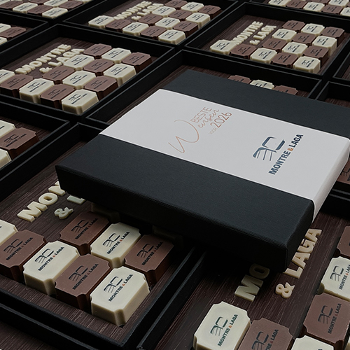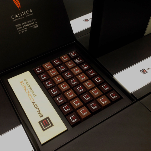 Bedank uw klanten met een fantastisch relatiegeschenk dat de identiteit van uw bedrijf helemaal in de verf zet. Calinor belooft u niet alleen indrukwekkende creaties die hemels smaken, we kunnen u ook de grafische expertise bieden om uw huisstijl helemaal te vertalen naar relatiegeschenken in chocolade. Van een gepersonaliseerde praline met logo tot een fotorealistische opdruk op een chocoladevoorwerp naar keuze. En dat allemaal in een verpakking op maat, met bedrukking op maat. Wedden dat u indruk maakt?